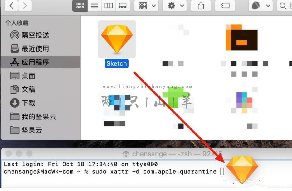 比如下面的软件,先把打不开的Sketch软件拖拽到应用程序文件夹里面,然后拷贝代码按空格键,把应用程序文件夹里面的Sketch软件拖拽进去按回车键,输入电脑密码
